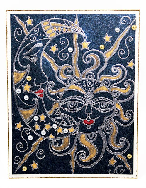 In the meantime, I made a fun card using the Stamptangle Celestial Montage stamp. The design reminded me of some of my Mardi Gras decorations!